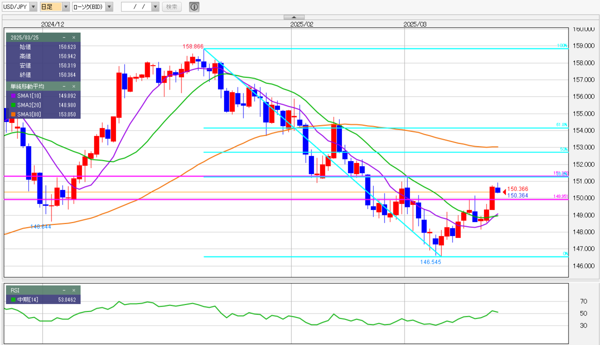ドル/円をテクニカル分析で見ると、3本の移動平均線が上向きでRSIが50を上抜けたことなどから上昇の勢いが強まったと見れます。そうした中、終値で150円台へ上昇したこともあり上値をトライしやすいチャート形状となっています。3月高値151.30円を明確に突破すればさらに反発基調を強める可能性があります。