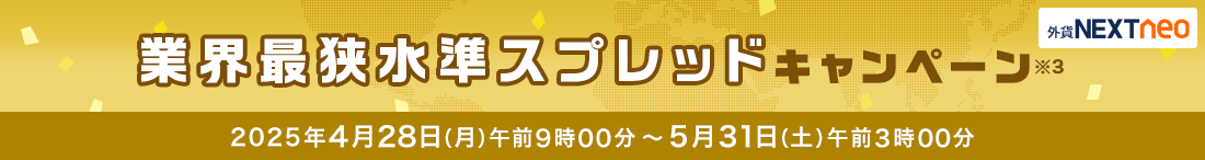 本広告は『外貨ネクストネオ』における1,000Lot以下のスプレッドを表示するものです。国内外の休日や平日早朝など市場の流動性が低い時間帯、主要経済指標の発表前後、ならびに天災地変または金融・経済関連の重大事件など予期せぬ突発的事象の発生時には、一時的にスプレッドを広告表示値よりも拡大する場合があります。当社のスプレッド表記は、提示率(全取引時間中に占める広告表示値以下のスプレッド提示時間の割合)を基に算出しております。本広告では、1pip=0.0001(米ドル、スイスフラン、豪ドル、英ポンド、カナダドル、NZドル)、1pip=0.001(トルコリラ)として表現しております。提示スプレッドにつきましては、当社の都合により予告なく変更または中止する場合があります。なお、ダイレクトカバーの対象となる注文(詳細はこちら)に適用されるスプレッドは本広告の対象外です。