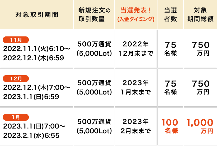 - 対象取引月間の新規取引の数量合計が、抽選の対象となる最低数量(5,000Lot(500万通貨))に満たない場合は、エントリーされたお客様であっても当該対象取引月間における抽選の対象外となりますので、十分ご注意のほどお願い申し上げます。