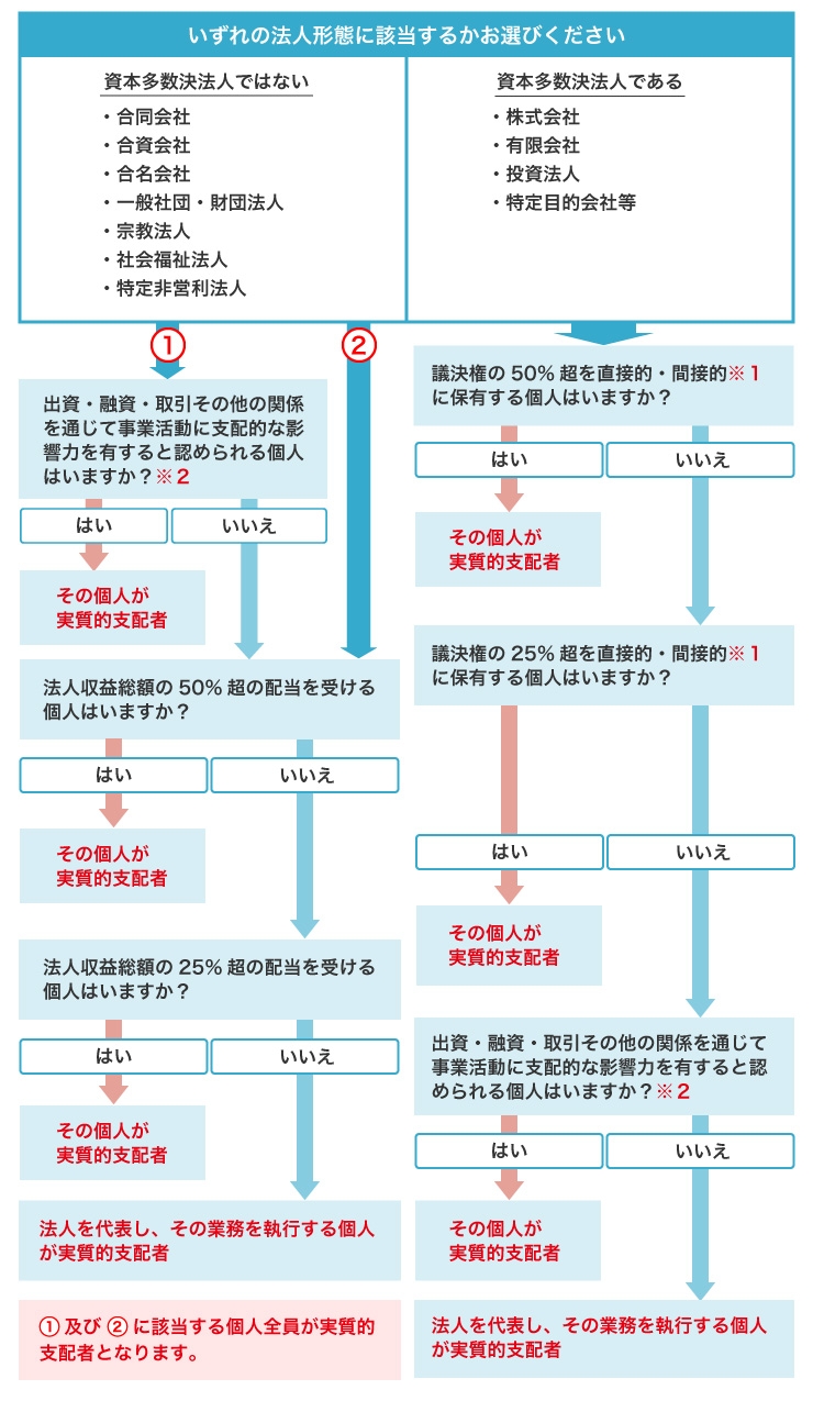 - 25%超の議決権を保有している方、又は25%超の収益配当を受けている方であっても、事業経営を実質的に支配する意思又は能力を有していないことが明らかな場合は、実質的支配者となりません。