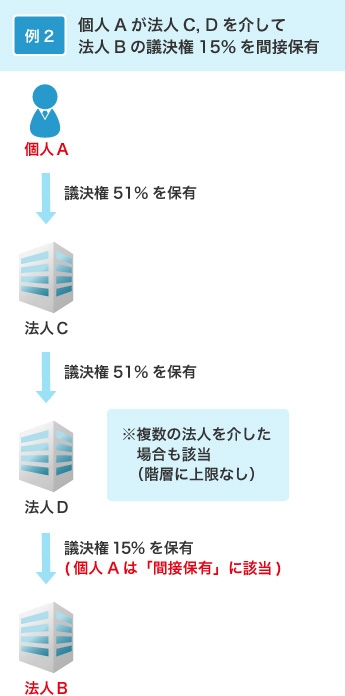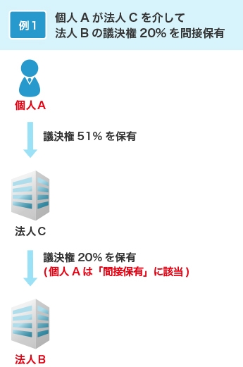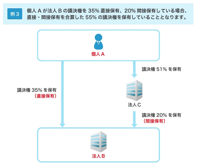 その個人が支配する法人(議決権の50%超を保有する法人)を介して、議決権を保有することをいいます。