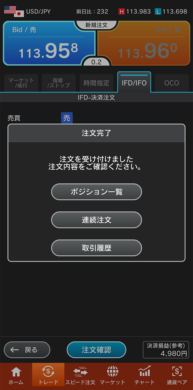 新規注文から決済注文まですべて自動で行ってくれるため、注文後は取引画面を開いていなくても約定して取引を完了させてくれる便利な注文方法です。ちなみに新規注文が約定しなければ、決済注文が発動されることはありません。