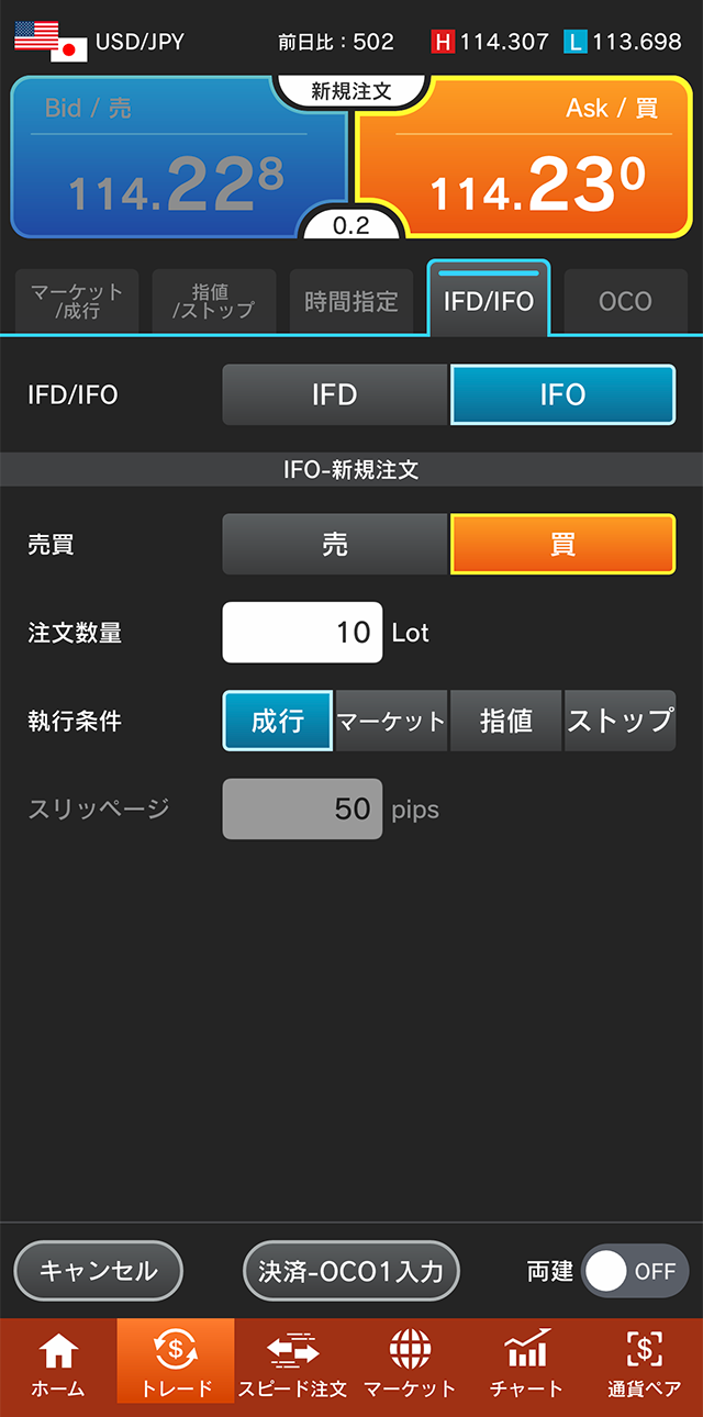 外為どっとコムが提供するスマホアプリ「外貨ネクストネオ(GFX)」で、IFO注文を発注するやり方について紹介します。