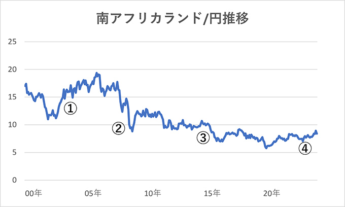 ①2004年あたりからは、高金利に着目したランド買いなどもあって、ランド円相場は堅調に推移。2006年には20円付近まで上昇しました。