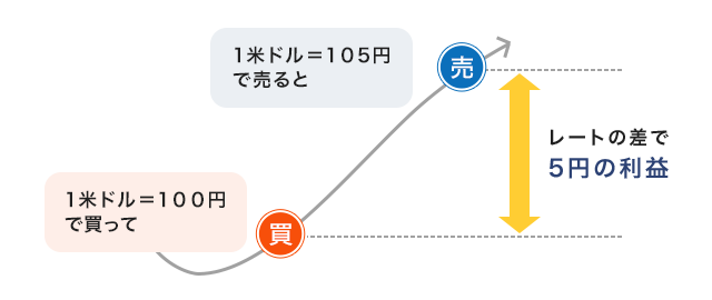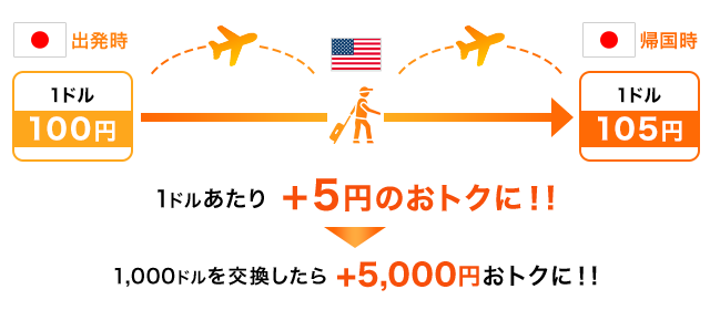 出発時に、日本で「1ドル=100円」で円を米ドルに交換したとします。そして、旅行を終えて帰国する際に、レート(通貨の交換比率)が「1ドル=105円」になっていたとしたら、日本円で5円(105円-100円)おトクになります。