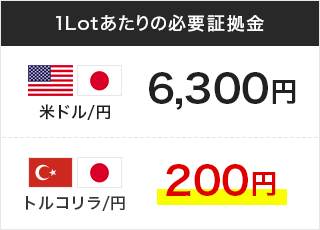 例えば1Lot(1千通貨)で取引する場合、米ドル円では6,300円程度が必要ですが、トルコリラ/円(TRY/JPY)だと200円です。(2025年12月1日時点)