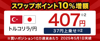 - 「スワップポイント最大40%増額キャンペーン」(対象期間:2025年12月1日(月)午前7時00分~2025年12月27日(土)午前6時55分)におけるスワップポイント上乗せ金額(所定の平均値集計期間における対象通貨ペア「トルコリラ/円」・「ユーロ/トルコリラ」受取スワップポイント平均値の40%相当、「米ドル/トルコリラ」同平均値の30%相当)、および当該上乗せ金額を記載営業日時点での対象通貨ペアの受取スワップポイント実績値に加算した金額です。当該キャンペーンにエントリーされたお客様が対象期間中に新規建てされた対象通貨ペアの所定の売買区分のポジションに限り、上乗せ金額の加算対象となります。