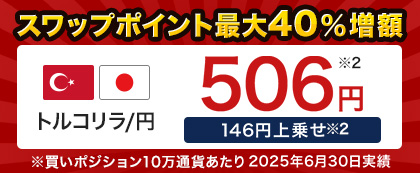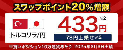 - 「スワップポイント最大40%増額キャンペーン」(対象期間:2025年12月1日(月)午前7時00分~2025年12月27日(土)午前6時55分)におけるスワップポイント上乗せ金額(所定の平均値集計期間における対象通貨ペア「トルコリラ/円」・「ユーロ/トルコリラ」受取スワップポイント平均値の40%相当、「米ドル/トルコリラ」同平均値の30%相当)、および当該上乗せ金額を記載営業日時点での対象通貨ペアの受取スワップポイント実績値に加算した金額です。当該キャンペーンにエントリーされたお客様が対象期間中に新規建てされた対象通貨ペアの所定の売買区分のポジションに限り、上乗せ金額の加算対象となります。