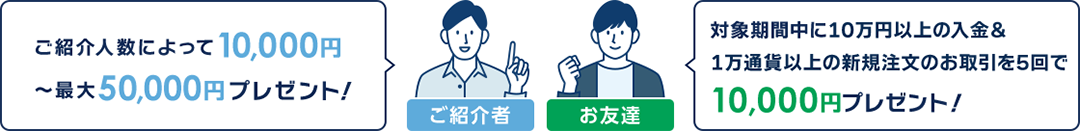 紹介人数に上限はございませんが、本キャンペーンの適用対象となる「お友達」の上限は5名様、50,000円まで!