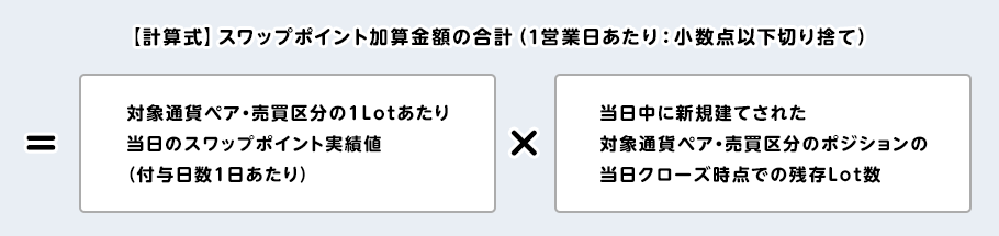 いずれの日も、当日営業日(オープン時刻~クローズ時刻)中に新規建てされ、かつ当日クローズ時点で残存していたポジションのみが対象となり、その数量に応じて当日のスワップポイント実績値(付与日数1日あたり)が加算されます。