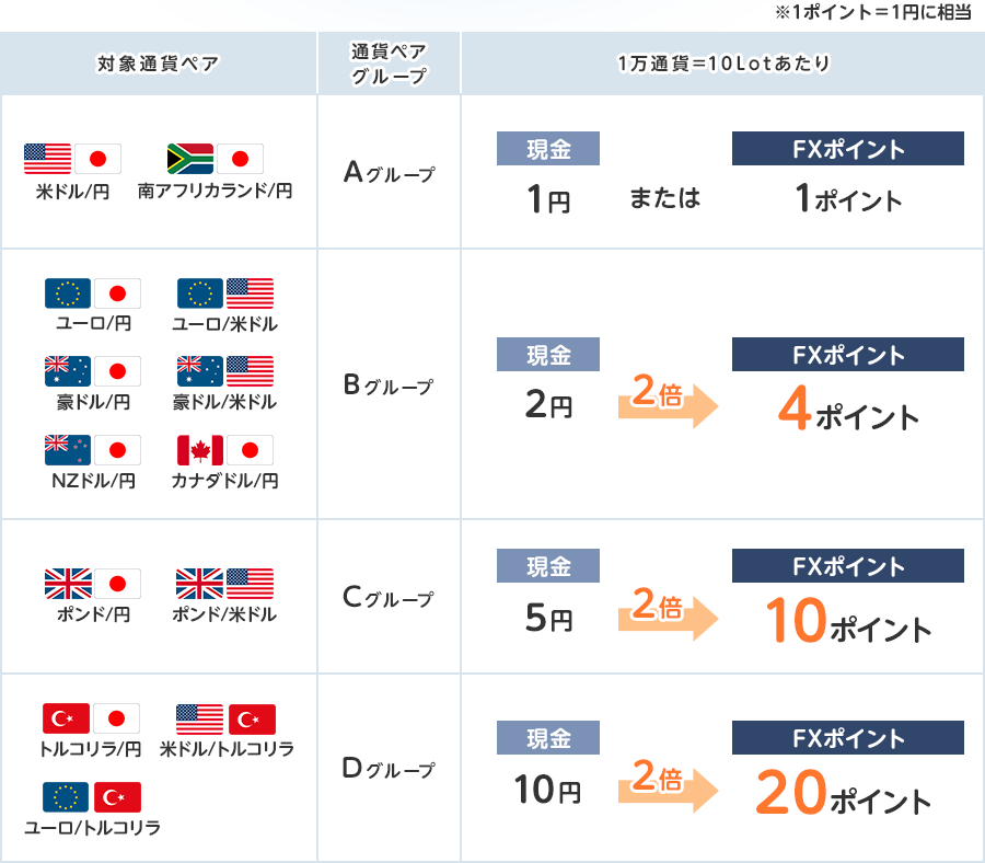 下記13通貨ペアの、グループ(A・B・C・D)毎の新規取引の数量合計が「1万通貨」の倍数に達する度に、所定の金額またはFXポイントを進呈いたします。なお、本キャンペーンにおける特典の適用上限は、通貨ペアグループA・B・C・D合計で現金を選択された場合は100万円、FXポイントを選択された場合は200万ポイントです。