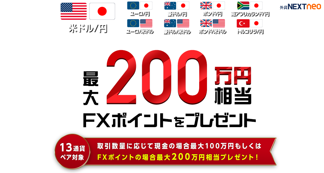 対象期間中にエントリーされ、かつ同期間中の『外貨ネクストネオ』における指定通貨ペアの新規注文の取引量に応じて、最大200万円相当のFXポイントをプレゼント、または、現金100万円のキャッシュバックをいたします。