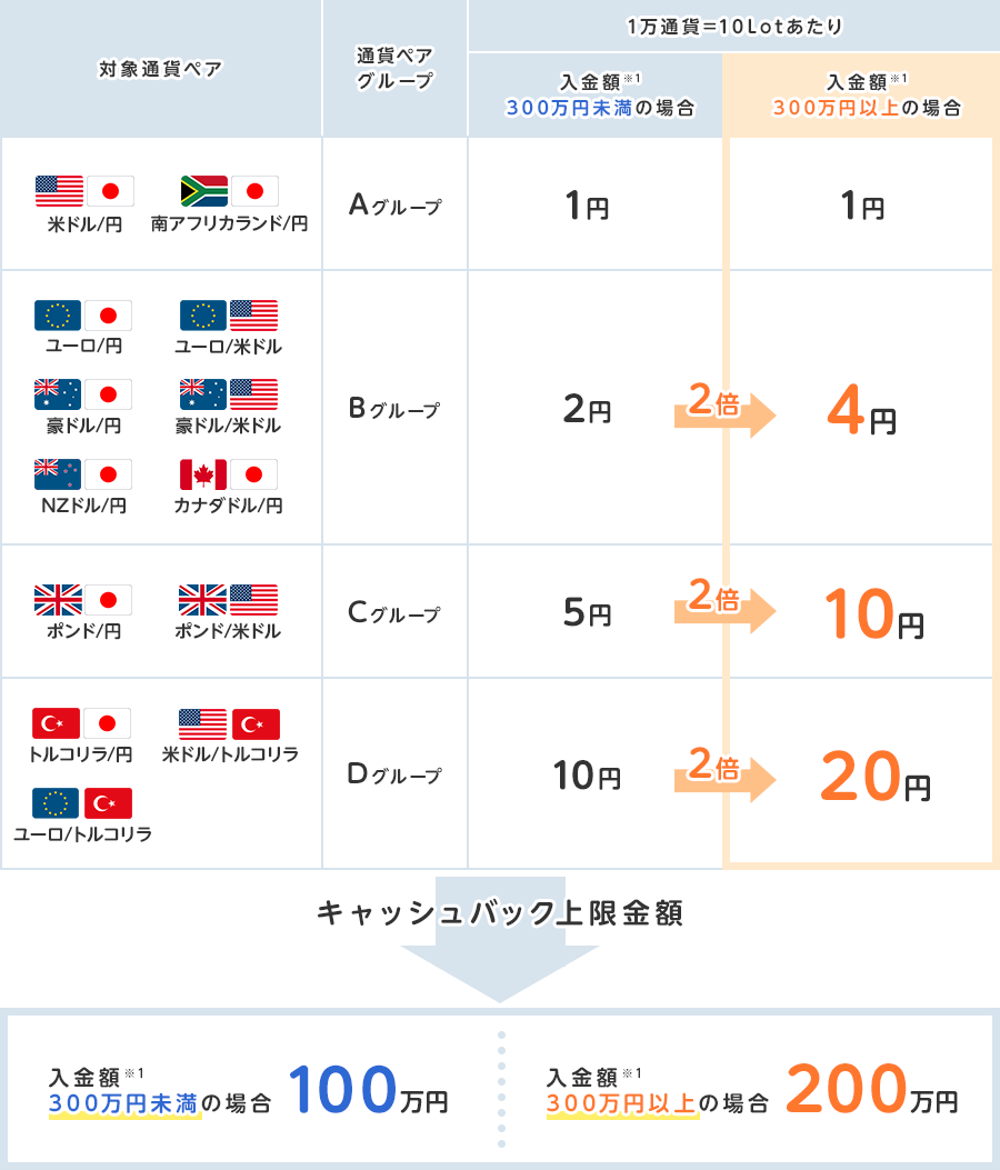 また、対象期間中の入金額※1が「300万円」以上となった場合には、一部通貨ペア拡大グループのキャッシュバック金額を倍増するとともに、その上限金額を200万円にまで拡大いたします。