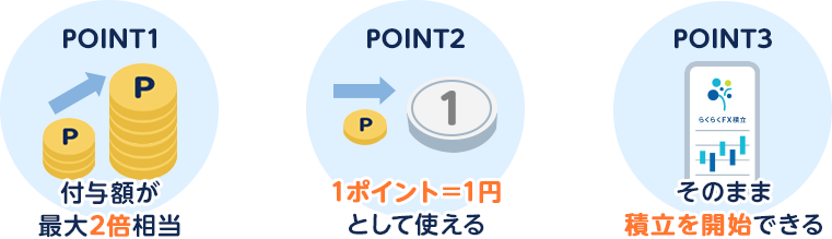FXポイントとは、当社各種サービスやキャンペーンによって獲得ができ、『らくらくFX積立』の買付注文にご利用できる、当社のオリジナル・ポイントサービスです。FXポイントに関する詳細はこちらをご覧ください。