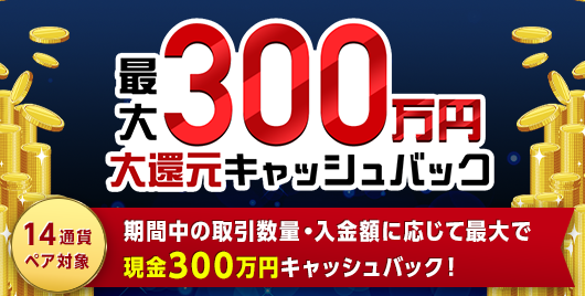 さらに、期間中の入金額※1に応じて全対象通貨ペアのキャッシュバック金額を最高で3倍、かつ上限300万円にまで拡大!