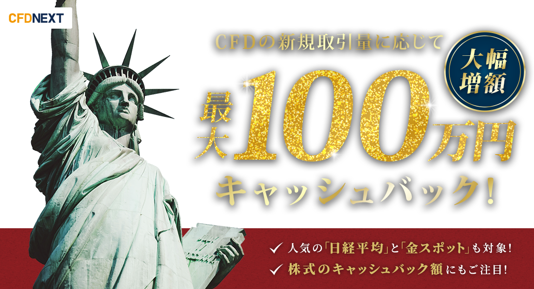 - 本キャンペーンは、上記「対象期間」中に『CFDネクスト』口座にて対象銘柄のお取引をされた方で、かつ、所定の条件(上記)を満たされた場合に限り、特典の適用対象となります。