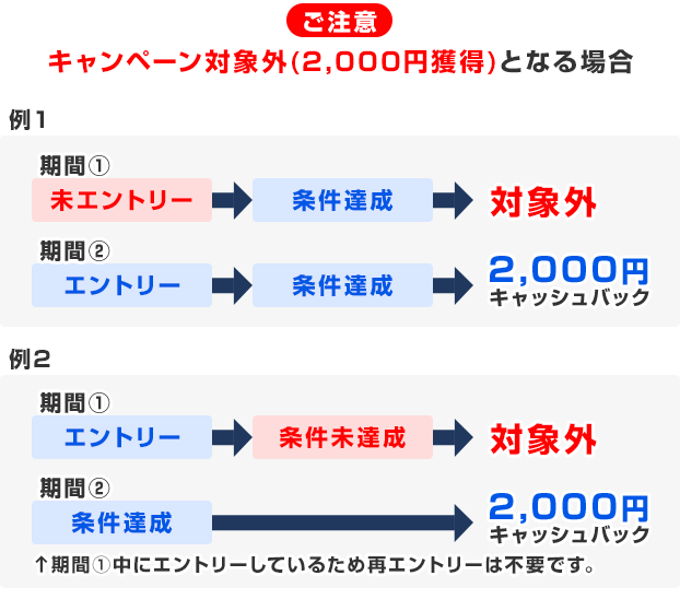 本キャンペーンでは、一度エントリーされますとそれ以降の各対象期間(①~②)を通じて有効となりますので、対象期間ごとにエントリーいただく必要はございません。