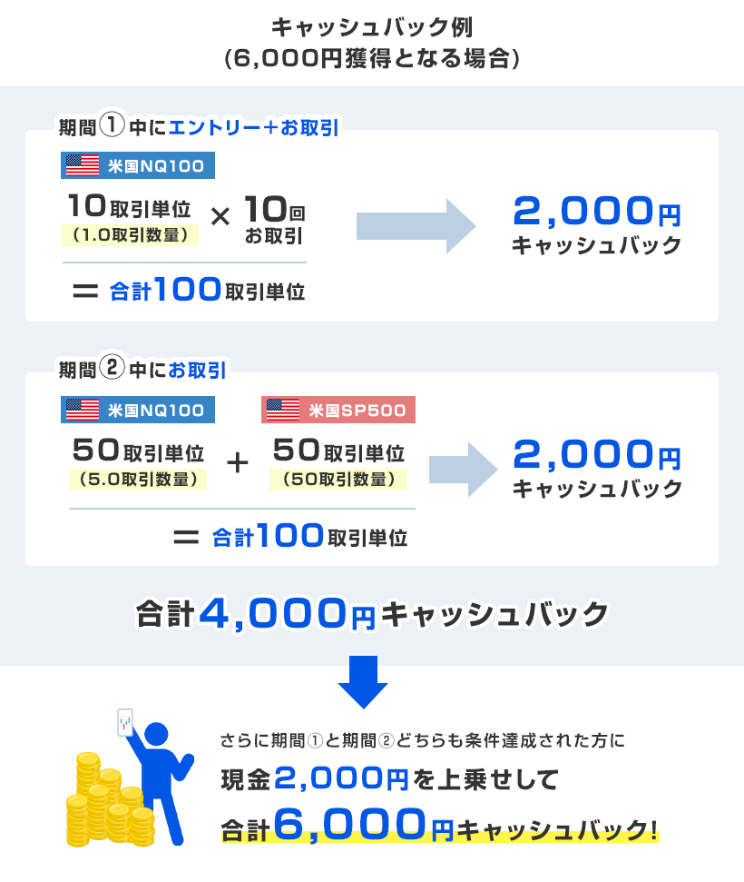 さらに、両期間ともに合計100取引単位のお取引をされたお客様には現金2,000円を上乗せし、合計6,000円をプレゼント!