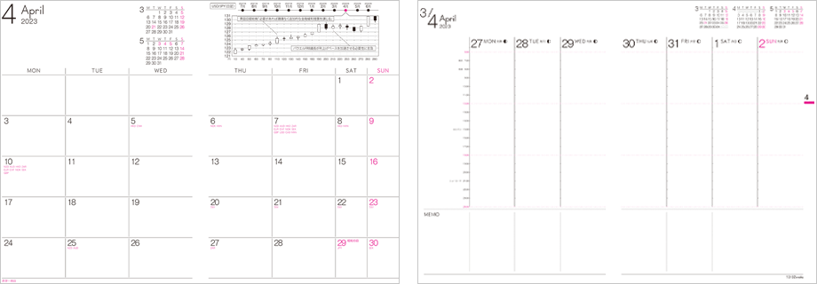 月間ダイアリーには、同じ季節性要因を持つ前年同月の米ドル/円日足チャートを併載。主要変動要因も添えられておりますので、前年同月の為替相場がどのような要因でどう推移したのかをひと目で把握できます。また近年のトレンドであるバーチカルタイプ(縦型)の週間ダイアリーには、日々の時間軸に主要金融市場のオープン時刻を表示。トレードの記録などにも使える、大きなメモ欄も大変便利です。加えて月間・週間ダイアリーとも、内外の政策金利発表に当たる日にはその旨を表記しております。