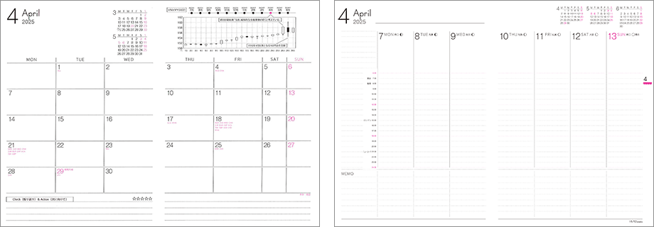 月間ダイアリーには、同じ季節性要因を持つ前年同月の米ドル/円日足チャートを併載。主要変動要因も添えられておりますので、前年同月の為替相場がどのような要因でどう推移したのかをひと目で把握できます。また近年のトレンドであるバーチカルタイプ(縦型)の週間ダイアリーには、日々の時間軸に主要金融市場のオープン時刻を表示。トレードの記録などにも使える、大きなメモ欄も大変便利です。