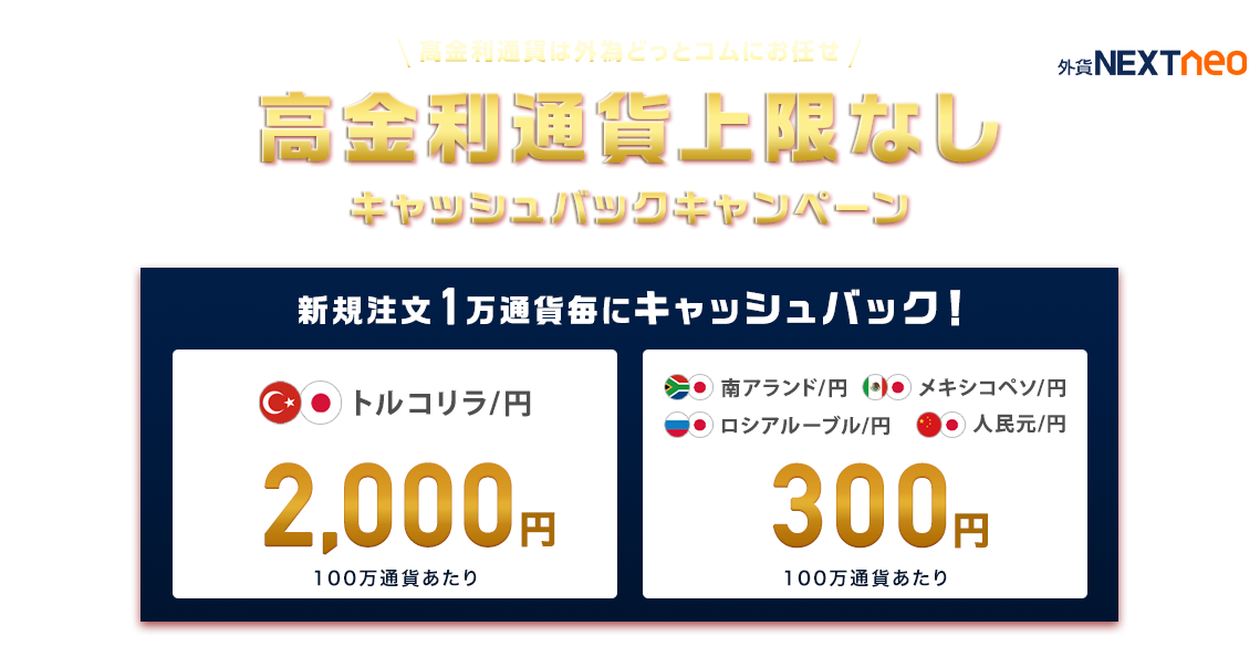 対象期間における『外貨ネクストネオ』の通貨ペア「南アフリカランド/円」「トルコリラ/円」「メキシコペソ/円」「ロシアルーブル/円」「人民元/円」の新規取引の数量合計がそれぞれ「1万通貨」〜の倍数に達する度に、所定の金額をキャッシュバックいたします(全チャネルのお取引が対象となります)。