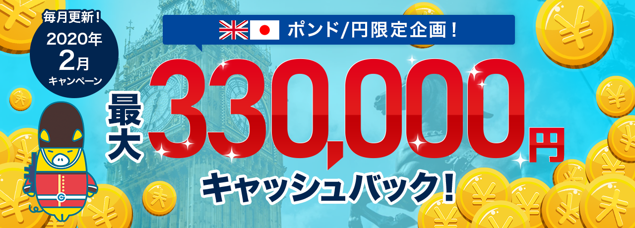 キャンペーン期間中の外貨ネクストネオでのGBP/JPY(ポンド/円)の取引高に応じて、最大33万円キャッシュバックいたします。