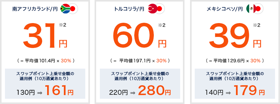対象期間中に新規建てされた「南アフリカランド/円」(ZAR/JPY)、「トルコリラ/円」(TRY/JPY)、「メキシコペソ/円」(MXN/JPY)の買ポジションに対し、同期間中の各営業日(月~金)のクローズ(取引終了時刻)をまたぐ度にその時点での数量、および当日のスワップポイント付与日数に応じて一定金額のスワップポイントを上乗せします。この上乗せ分は期間終了後にまとめて入金いたします。
