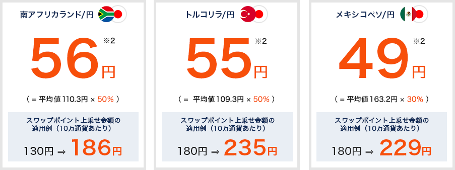 対象期間中に『外貨ネクストネオ』にて新規建てされた「南アフリカランド/円」(ZAR/JPY)、「トルコリラ/円」(TRY/JPY)、「メキシコペソ/円」(MXN/JPY)の買ポジションに対し、同期間中の各営業日(月~金)のクローズ(取引終了時刻)をまたぐ度にその時点での数量、および当日のスワップポイント付与日数に応じて一定金額のスワップポイントを上乗せします。この上乗せ分は期間終了後にまとめて入金いたします。