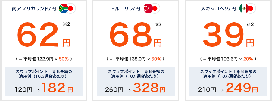 対象期間中に『外貨ネクストネオ』にて新規建てされた「南アフリカランド/円」(ZAR/JPY)、「トルコリラ/円」(TRY/JPY)、「メキシコペソ/円」(MXN/JPY)の買ポジションに対し、同期間中の各営業日(月~金)のクローズ(取引終了時刻)をまたぐ度にその時点での数量、および当日のスワップポイント付与日数に応じて一定金額のスワップポイントを上乗せします。この上乗せ分は期間終了後にまとめて入金いたします。