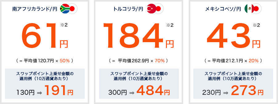 - 「スワップポイント最大70%増額キャンペーン」(対象期間:2023年5月1日(月)午前7時00分~2023年6月3日(土)午前5時55分)におけるスワップポイント上乗せ金額(所定の平均値集計期間における対象通貨ペア「トルコリラ/円」受取スワップポイント平均値の70%相当、「南アフリカランド/円」同平均値の50%相当、「メキシコペソ/円」同平均値の20%相当)、および当該上乗せ金額を記載営業日時点での対象通貨ペアの受取スワップポイント実績値に加算した金額です。当該キャンペーンにエントリーされたお客様が対象期間中に新規建てされた対象通貨ペアの買ポジションに限り、上乗せ金額の加算対象となります。なお、当該キャンペーンの対象となる新興国通貨取引には特有のリスクがございます。詳細につきましてはこちらをご参照願います。