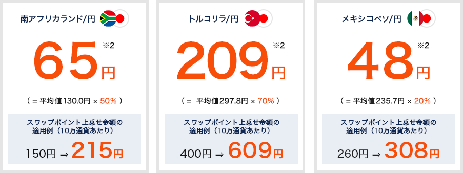 - 「スワップポイント最大70%増額キャンペーン」(対象期間:2023年6月5日(月)午前7時00分~2023年7月1日(土)午前5時55分)におけるスワップポイント上乗せ金額(所定の平均値集計期間における対象通貨ペア「トルコリラ/円」受取スワップポイント平均値の70%相当、「南アフリカランド/円」同平均値の50%相当、「メキシコペソ/円」同平均値の20%相当)、および当該上乗せ金額を記載営業日時点での対象通貨ペアの受取スワップポイント実績値に加算した金額です。当該キャンペーンにエントリーされたお客様が対象期間中に新規建てされた対象通貨ペアの買ポジションに限り、上乗せ金額の加算対象となります。なお、当該キャンペーンの対象となる新興国通貨取引には特有のリスクがございます。詳細につきましてはこちらをご参照願います。