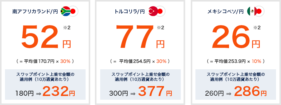 対象期間中に『外貨ネクストネオ』にて新規建てされた「南アフリカランド/円」(ZAR/JPY)、「トルコリラ/円」(TRY/JPY)、「メキシコペソ/円」(MXN/JPY)の買ポジションに対し、同期間中の各営業日(月~金)のクローズ(取引終了時刻)をまたぐ度にその時点での数量、および当日のスワップポイント付与日数に応じて一定金額のスワップポイントを上乗せします。この上乗せ分は期間終了後にまとめて入金いたします。