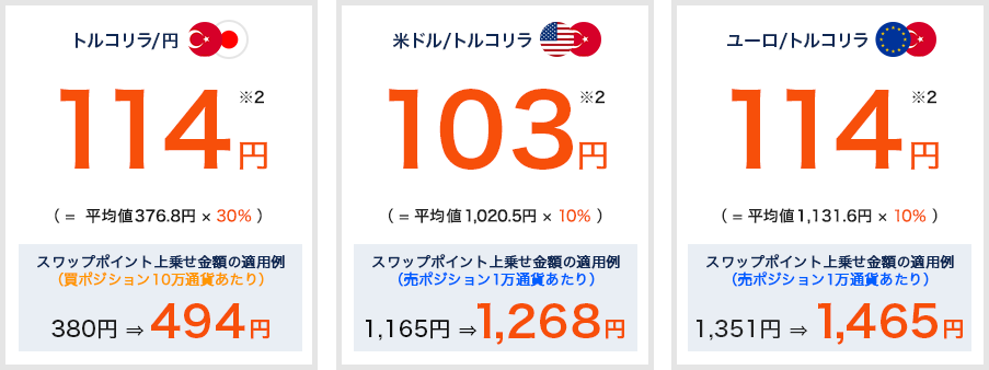 対象期間中に『外貨ネクストネオ』にて新規建てされた「トルコリラ/円」(TRY/JPY)の買ポジション、「米ドル/トルコリラ」(USD/TRY)・「ユーロ/トルコリラ」(EUR/TRY)の売ポジションに対し、同期間中の各営業日(月~金)のクローズ(取引終了時刻)をまたぐ度にその時点での数量、および当日のスワップポイント付与日数に応じて一定金額のスワップポイントを上乗せします。この上乗せ分は通貨ペア毎に10万円を上限として、期間終了後にまとめて入金いたします。
