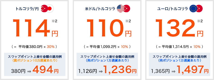 対象期間中に『外貨ネクストネオ』にて新規建てされた「トルコリラ/円」(TRY/JPY)の買ポジション、「米ドル/トルコリラ」(USD/TRY)・「ユーロ/トルコリラ」(EUR/TRY)の売ポジションに対し、同期間中の各営業日(月~金)のクローズ(取引終了時刻)をまたぐ度にその時点での数量、および当日のスワップポイント付与日数に応じて一定金額のスワップポイントを上乗せします。この上乗せ分は通貨ペア毎に10万円を上限として、期間終了後にまとめて入金いたします。