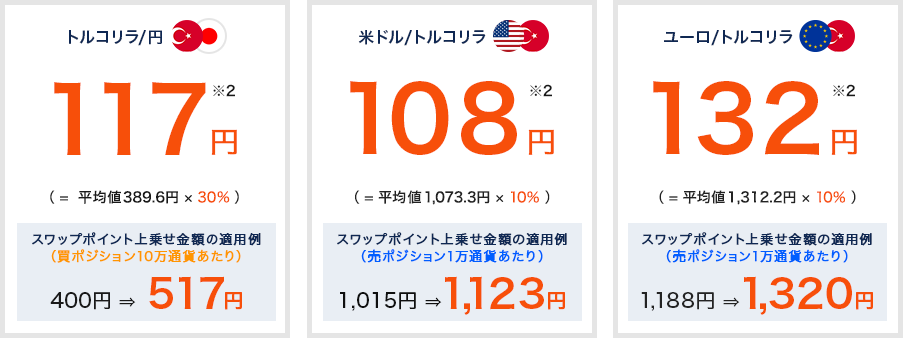 対象期間中に『外貨ネクストネオ』にて新規建てされた「トルコリラ/円」(TRY/JPY)の買ポジション、「米ドル/トルコリラ」(USD/TRY)・「ユーロ/トルコリラ」(EUR/TRY)の売ポジションに対し、同期間中の各営業日(月~金)のクローズ(取引終了時刻)をまたぐ度にその時点での数量、および当日のスワップポイント付与日数に応じて一定金額のスワップポイントを上乗せします。この上乗せ分は通貨ペア毎に10万円を上限として、期間終了後にまとめて入金いたします。