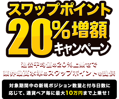 - 本キャンペーンにおいてお客様に適用されるスワップポイント加算金額は、スワップポイント上乗せ金額(上記平均値集計期間の対象通貨ペアのスワップポイント平均値に20%を乗じた額)を1,000通貨(1Lot)あたりに引き直した額(対円通貨ペアは小数点第3位以下、その他通貨ペアは小数点第2位以下切り上げ)を適用単位とし、これに対象期間中の各営業日(月~金曜日)のクローズをまたいだ適用対象ポジションのLot数と、当該営業日のスワップポイント付与日数を乗じた値の合計を通貨ペア毎に算出し、これらを合算した金額となります(通貨ペア毎に小数点以下切り捨て、かつ通貨ペア毎に10万円を上限)。この結果として通貨ペア毎に確定した額が1円に満たない場合には、当該通貨ペア分のスワップポイント加算金額の入金はなされませんので、あらかじめご承知おき願います。