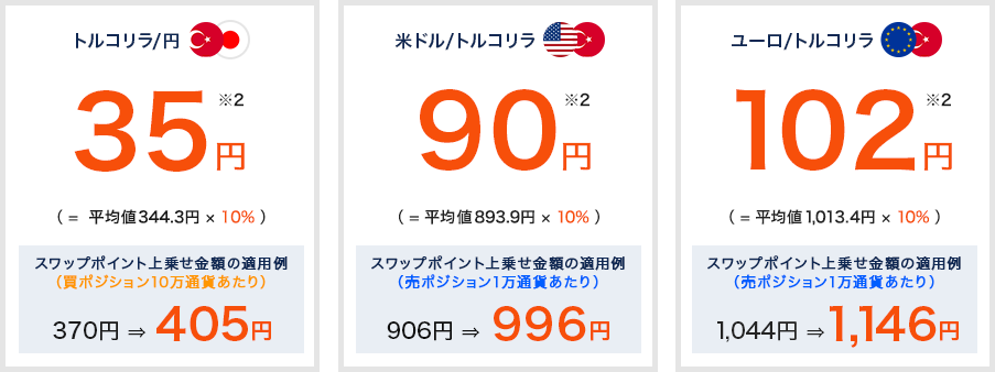 対象期間中に『外貨ネクストネオ』にて新規建てされた「トルコリラ/円」(TRY/JPY)の買ポジション、「米ドル/トルコリラ」(USD/TRY)・「ユーロ/トルコリラ」(EUR/TRY)の売ポジションに対し、同期間中の各営業日(月~金)のクローズ(取引終了時刻)をまたぐ度にその時点での数量、および当日のスワップポイント付与日数に応じて一定金額のスワップポイントを上乗せします。この上乗せ分は通貨ペア毎に10万円を上限として、期間終了後にまとめて入金いたします。