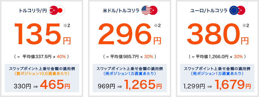 - 「スワップポイント最大40%増額キャンペーン」(対象期間:2025年7月28日(月)午前7時00分~2025年8月30日(土)午前5時55分)におけるスワップポイント上乗せ金額(所定の平均値集計期間における対象通貨ペア「トルコリラ/円」受取スワップポイント平均値の40%相当、「米ドル/トルコリラ」・「ユーロ/トルコリラ」同平均値の30%相当)、および当該上乗せ金額を記載営業日時点での対象通貨ペアの受取スワップポイント実績値に加算した金額です。当該キャンペーンにエントリーされたお客様が対象期間中に新規建てされた対象通貨ペアの所定の売買区分のポジションに限り、上乗せ金額の加算対象となります。なお、当該キャンペーンの対象となる新興国通貨取引には特有のリスクがございます。詳細につきましてはこちらをご参照願います。