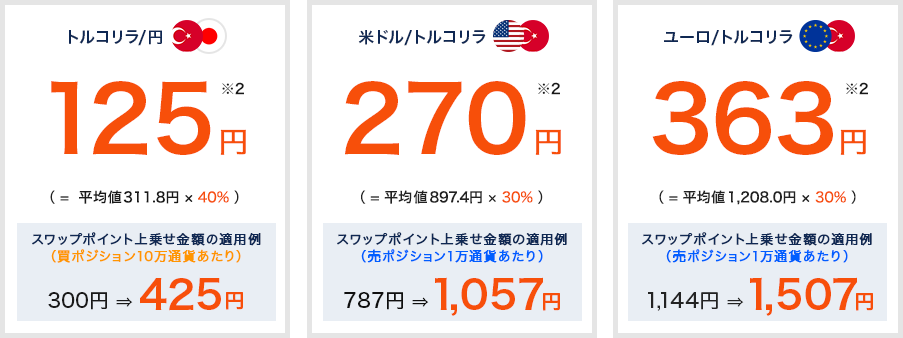 2025年9月27日(土)午前5時55分2025年10月4日(土)午前5時55分)におけるスワップポイント上乗せ金額(所定の平均値集計期間における対象通貨ペア「トルコリラ/円」受取スワップポイント平均値の40%相当、「米ドル/トルコリラ」・「ユーロ/トルコリラ」同平均値の30%相当)、および当該上乗せ金額を記載営業日時点での対象通貨ペアの受取スワップポイント実績値に加算した金額です。当該キャンペーンにエントリーされたお客様が対象期間中に新規建てされた対象通貨ペアの所定の売買区分のポジションに限り、上乗せ金額の加算対象となります。なお、当該キャンペーンの対象となる新興国通貨取引には特有のリスクがございます。詳細につきましてはこちらをご参照願います。