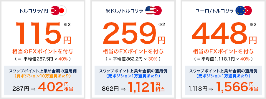 - 「スワップポイント最大40%増額キャンペーン」(対象期間:2025年12月29日(月)午前7時00分~2026年1月31日(土)午前6時55分)におけるスワップポイント上乗せ金額(所定の平均値集計期間における対象通貨ペア「トルコリラ/円」・「ユーロ/トルコリラ」受取スワップポイント平均値の40%相当、「米ドル/トルコリラ」同平均値の30%相当)。当該キャンペーンにエントリーされたお客様が対象期間中に新規建てされた対象通貨ペアの所定の売買区分のポジションに限り、上乗せ金額の加算対象となります。なお、当該キャンペーンの対象となる新興国通貨取引には特有のリスクがございます。詳細につきましてはこちらをご参照願います。