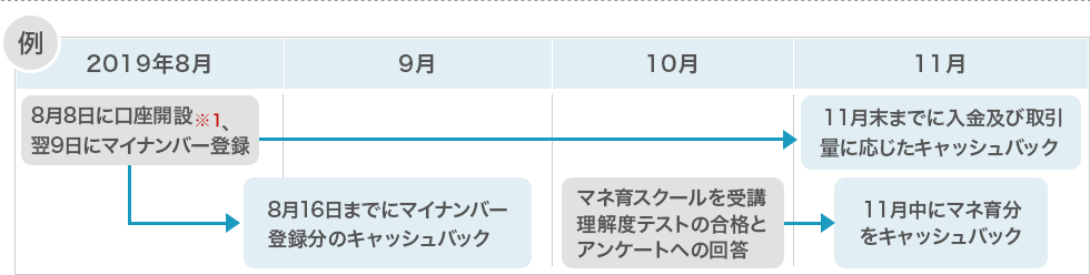 ●合計1万円以上の入金:口座開設月[※1]から3ヶ月後の月末までに「マイページ」内に入金いたします。