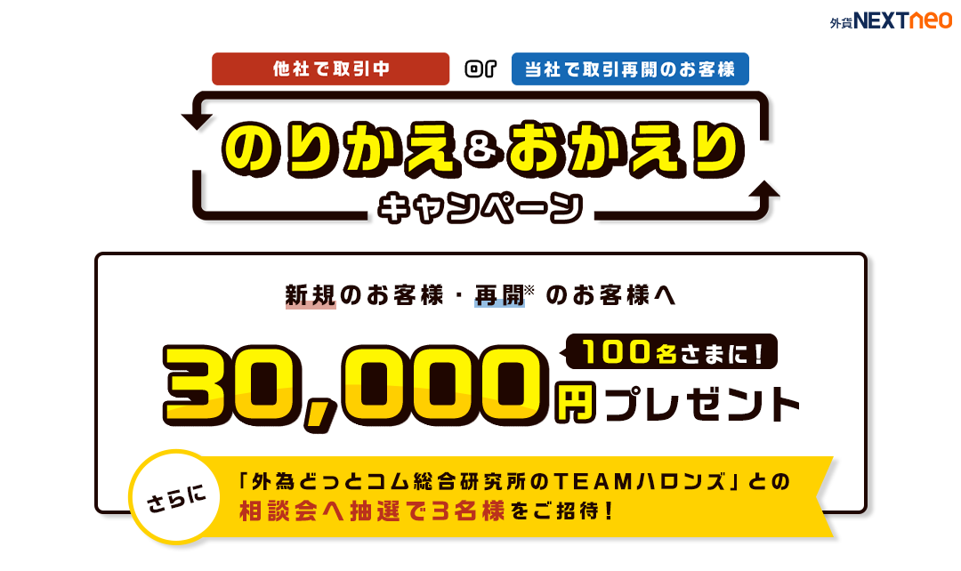 10万通貨以上の新規取引で抽選で100名様に3万円をプレゼント!