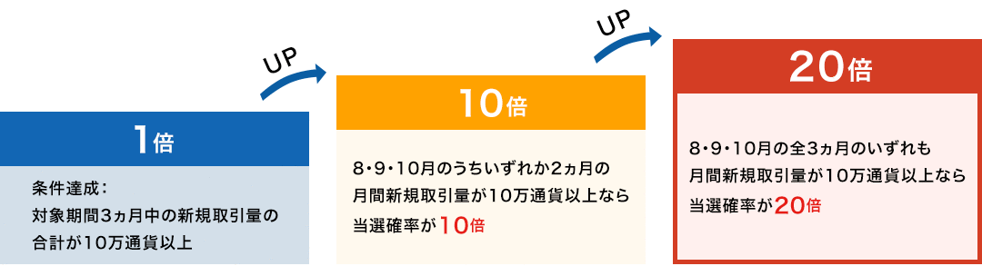 さらに本キャンペーン期間中の新規取引の継続で当選確率上昇し、最大20倍になります!
