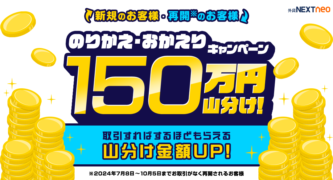 - 本キャンペーンでいう「合計10万円以上をご入金」とは、対象期間中の「純増額」(『外貨ネクストネオ』口座への(振替)入金額合計と『外貨ネクストネオ』口座からの(振替)出金額合計の差額)が10万円以上となることを指します。