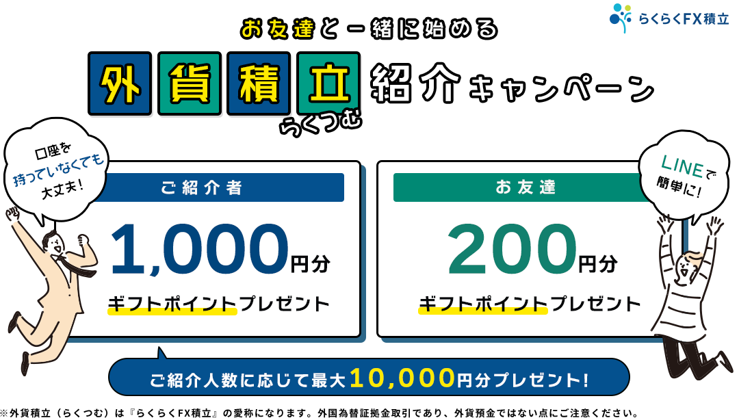 - 「お友達」が本キャンペーン対象期間内に『らくらくFX積立』口座を開設された場合であっても、過去に『らくらくFX積立』口座を開設されたことがある場合には、本キャンペーンの適用対象外となります。