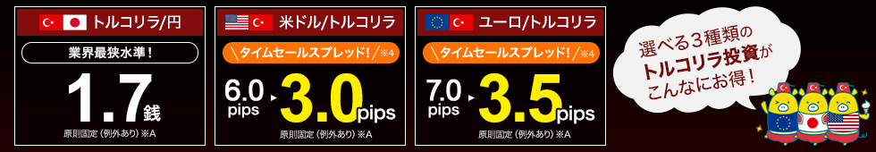 ※A 原則固定スプレッドは各営業日午前9時~翌午前3時の時間帯にて提供(例外あり)。国内外の休日や平日早朝など市場の流動性が低い時間帯、主要経済指標の発表前後、ならびに天災地変または金融・経済関連の重大事件など予期せぬ突発的事象の発生時には、一時的にスプレッドを広告表示値よりも拡大する場合がございます。なお当社のスプレッド表記は、提示率(全取引時間中に占める広告表示値以下のスプレッド提示時間の割合)を基に算出しております。本広告では、1pip=0.0001(米ドル、スイスフラン、豪ドル、英ポンド、カナダドル、NZドル)、1pip=0.001(トルコリラ)として表現しております。提示スプレッドにつきましては、当社の都合により予告なく変更または中止する場合があります。