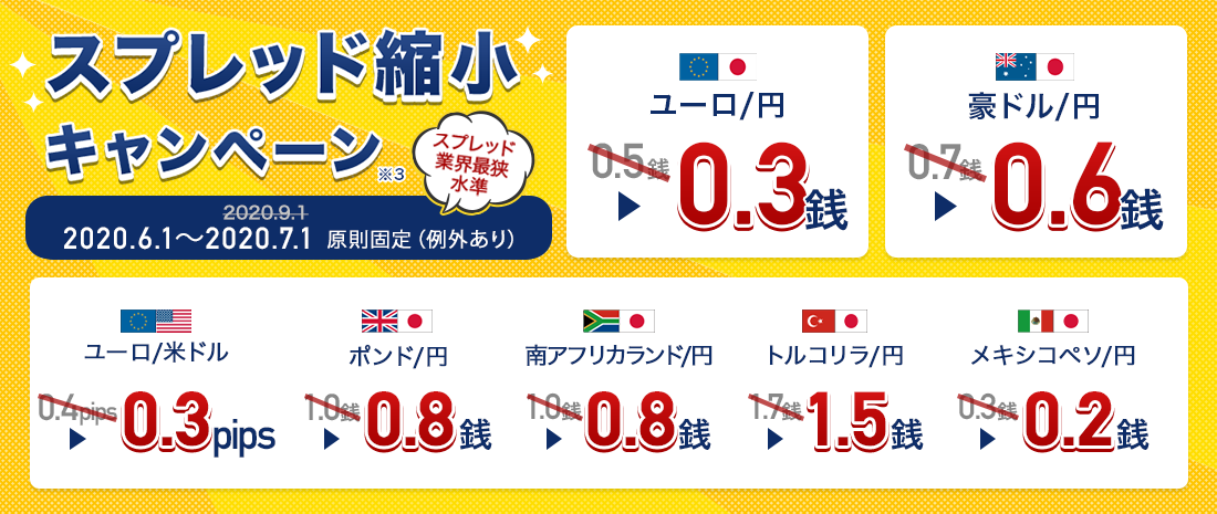 ※3 「ユーロ/円0.3銭!全9種スプレッド縮小キャンペーン」スプレッド(対象期間:2020年6月1日(月)午前9時~ 2020年9月1日(火)午前3時 2020年7月1日(水)午前3時)