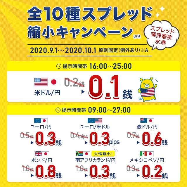 ※3 「米ドル/円0.1銭!全10種スプレッド縮小キャンペーン」スプレッド(対象期間:2020年9月1日(火)午前9時~2020年10月1日(木)午前3時、提示時間帯:米ドル/円は対象期間中の各営業日午後4時~翌午前1時、その他9通貨ペアは対象期間中の各営業日午前9時~翌午前3時)