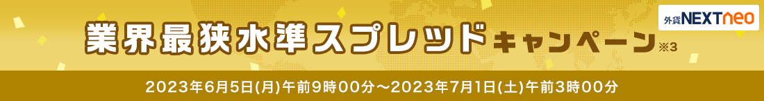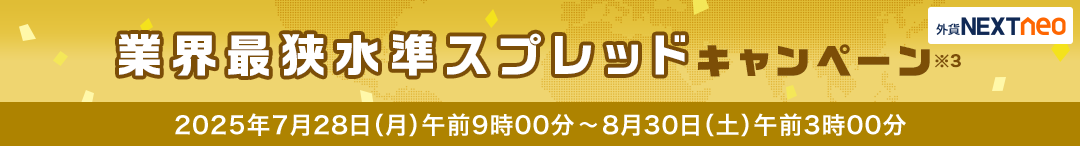 本広告は『外貨ネクストネオ』における1,000Lot以下のスプレッドを表示するものです。国内外の休日や平日早朝など市場の流動性が低い時間帯、主要経済指標の発表前後、ならびに天災地変または金融・経済関連の重大事件など予期せぬ突発的事象の発生時には、一時的にスプレッドを広告表示値よりも拡大する場合があります。当社のスプレッド表記は、提示率(全取引時間中に占める広告表示値以下のスプレッド提示時間の割合)を基に算出しております。本広告では、1pip=0.0001(米ドル、スイスフラン、豪ドル、英ポンド、カナダドル、NZドル)、1pip=0.001(トルコリラ)として表現しております。提示スプレッドにつきましては、当社の都合により予告なく変更または中止する場合があります。なお、ダイレクトカバーの対象となる注文(詳細はこちら)に適用されるスプレッドは本広告の対象外です。