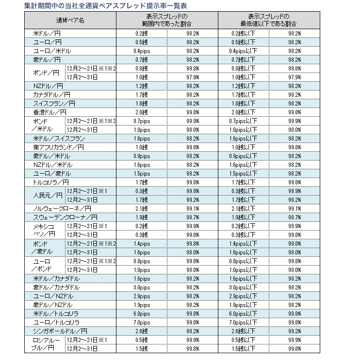 ※2 該当通貨ペアの2019年12月12~13日の提示スプレッドは広告表示値の適用対象外であるため、上表には含んでおりません。